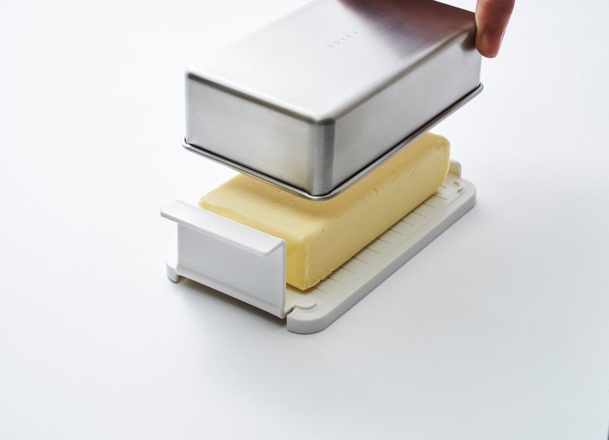 "A butter case combining stainless steel and resin, designed to enhance container sealing.