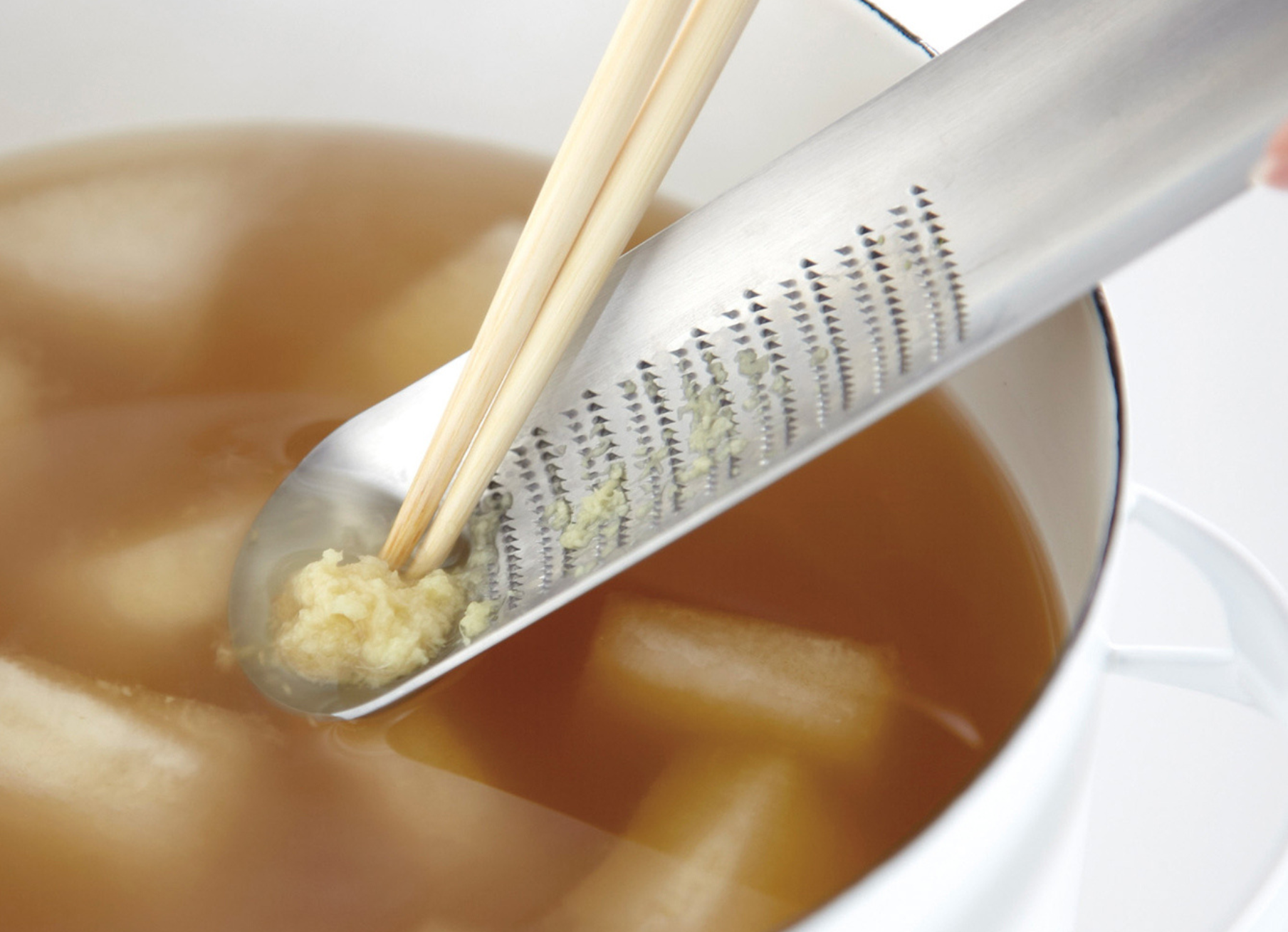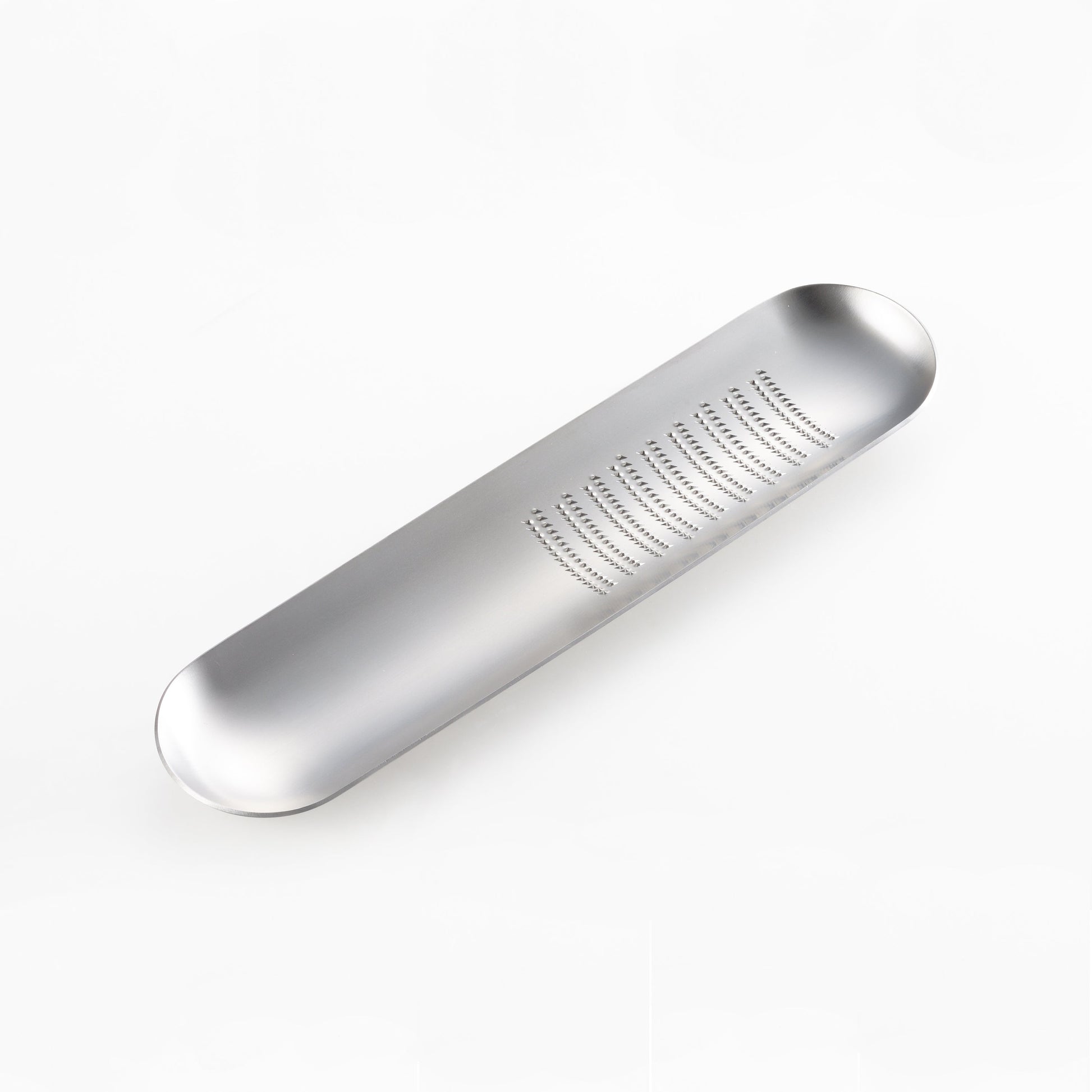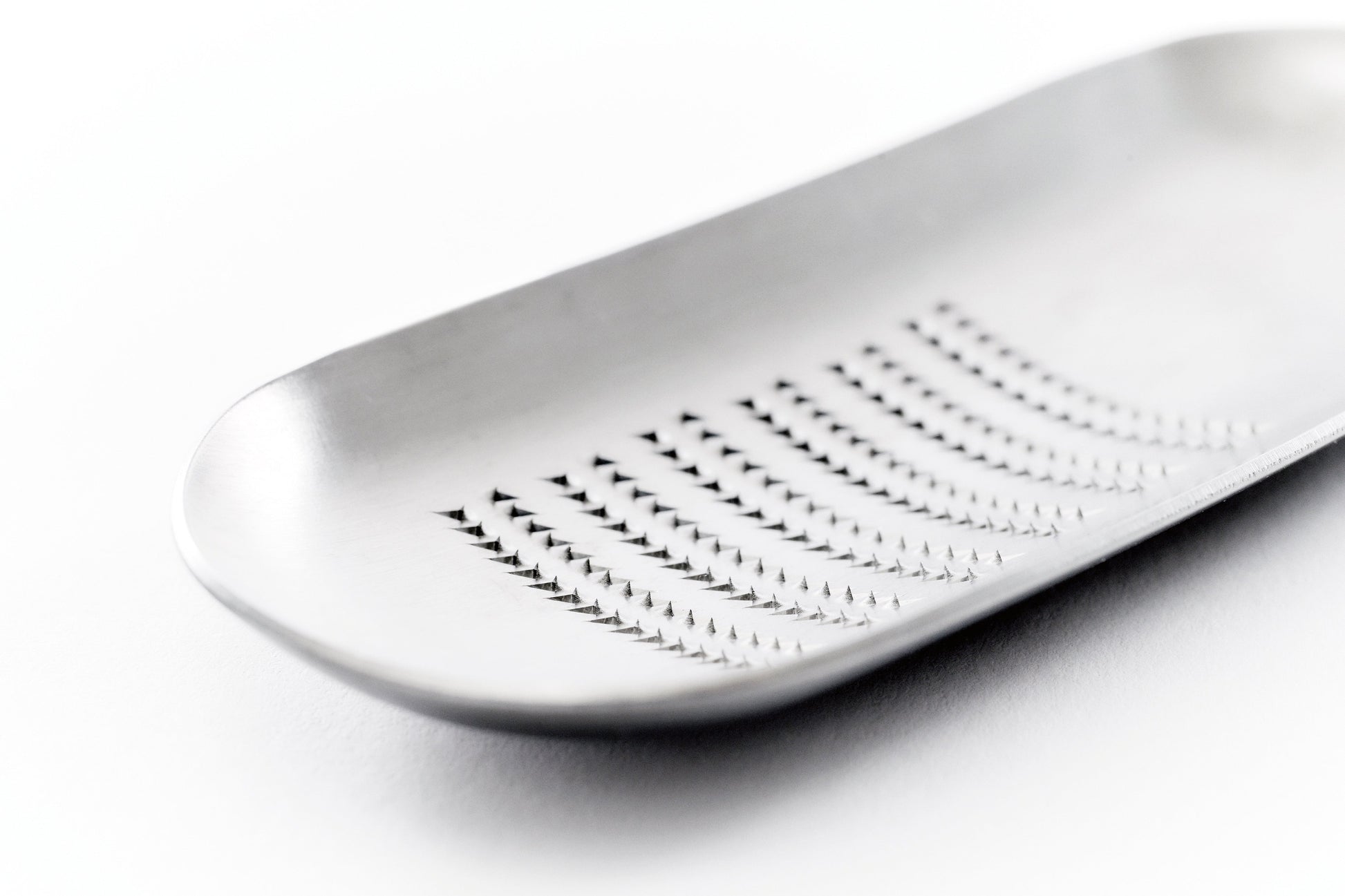 The tray-shaped design with curved edges prevents grated juices from spilling, allowing you to add condiments to dishes like soups and stews while they dissolve.
