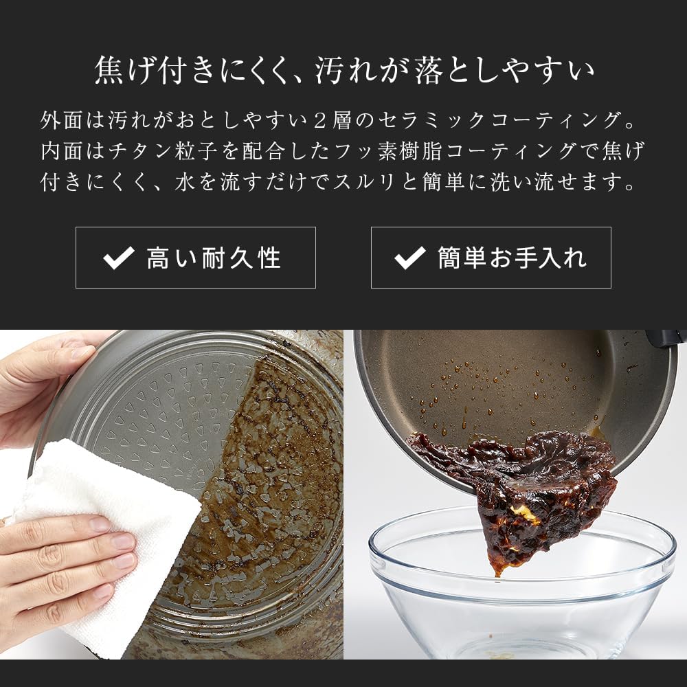Non-Stick Coating: Features a dual-layer ceramic coating on the exterior and a fluorine resin coating with titanium particles on the interior for easy cleaning and durability.